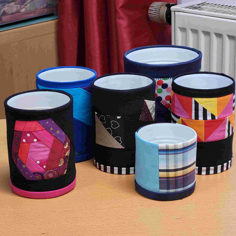 Hier habe ich eine Blechdose mit einem Stoffring bezogen. Die Applikationen sind aus Baumwolle.