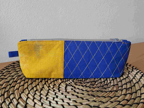 Es kann als Schminktasche oder ähnliches verwendet werden. Aus Baumwollstoffen mit Innenfutter genäht. Geschlossen wird sie mit einem Reißverschluss.